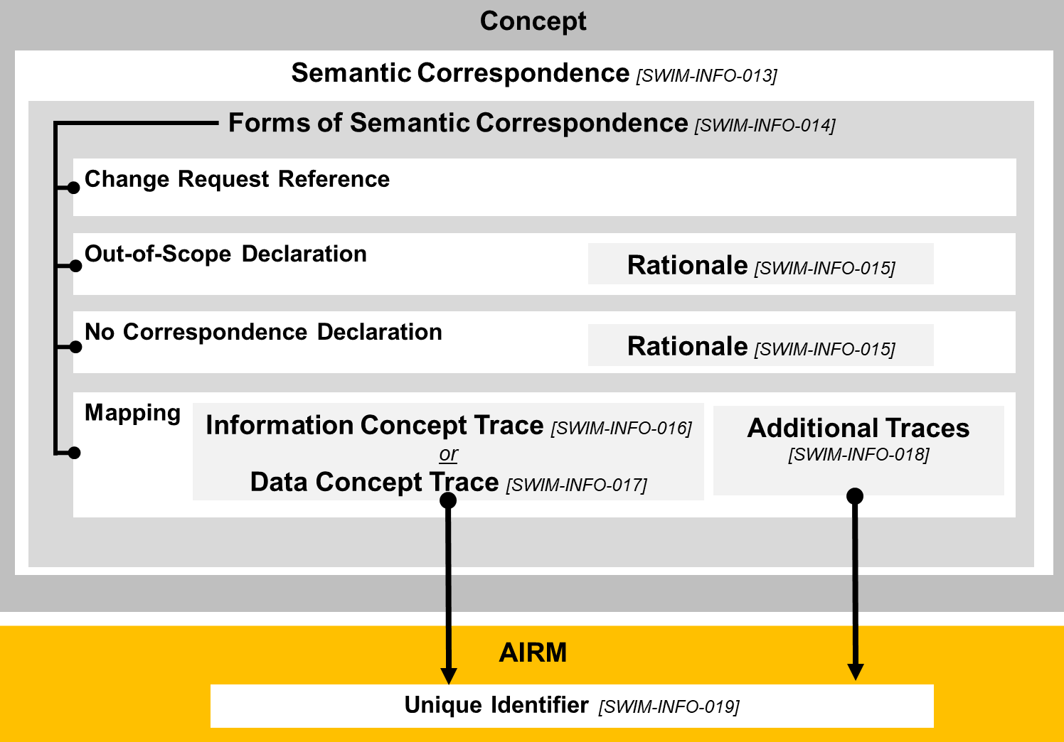 Each concept needs a semantic correspondence statement. This correspondence can be in one of four forms (SWIM-INFO-014).