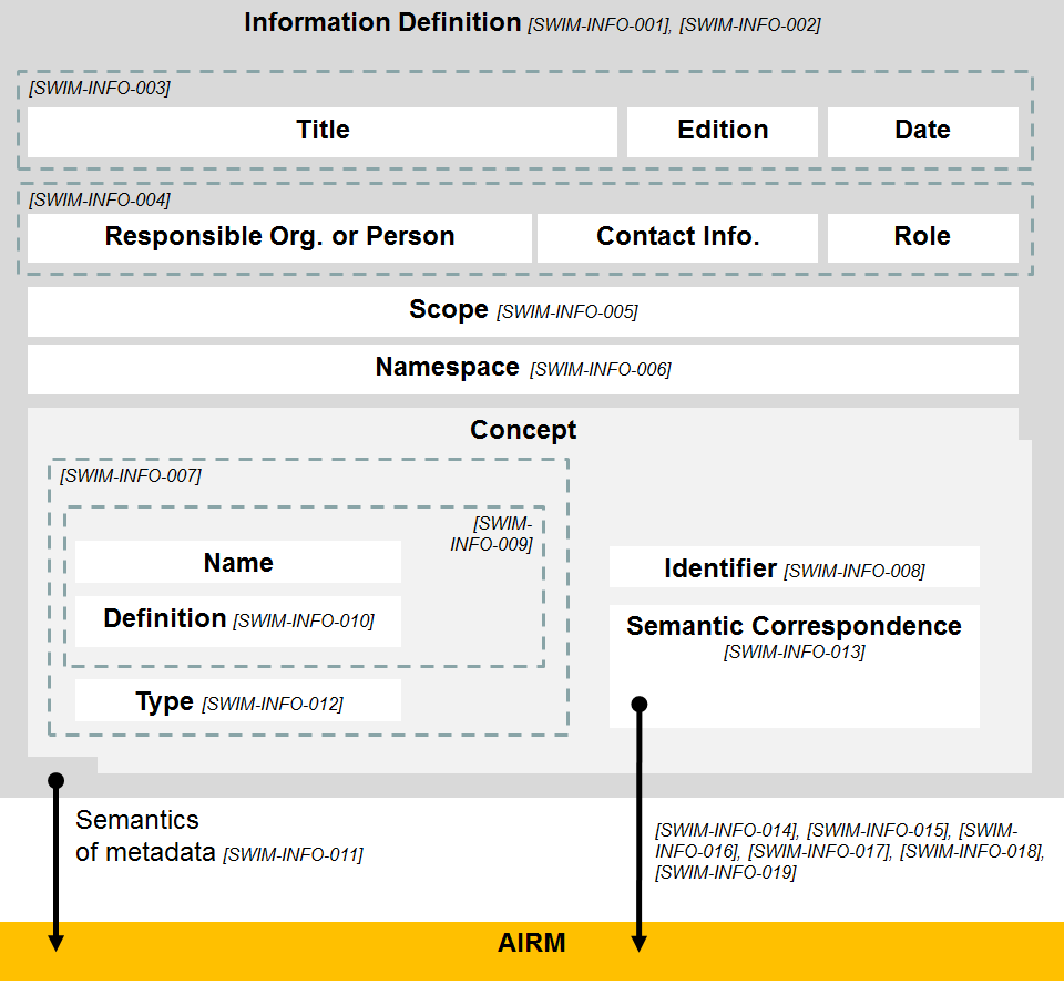 The remaining requirements apply to all of the concepts in the information definition. These include the basic needs such as to name and define the concept. There is also a need to give a semantic correspondence statement for each concept. The semantic correspondence requirements (SWIM-INFO-013 to SWIM-INFO-019) explain how the concepts in an information definition are "related" to the AIRM concepts.