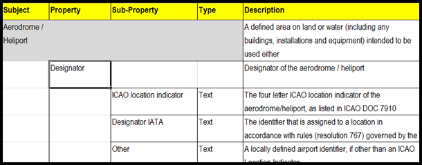 Data catalogues are used to list details on the exchanged information. They are often used as a way of agreeing the information that is to be captured and exchanged as part of a publication process. The figure below is taken from the ICAO PANS-AIM Data Catalogue. It is in tabular format and details "subjects", "properties", "types" and their "descriptions". A data catalogue can contain many more items such as requirements on the accuracy of the data to be collected.