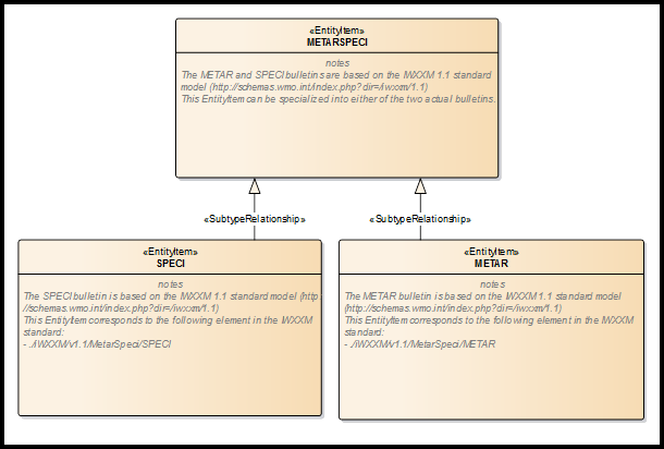 The figure is taken from a service description for a service exchanging METAR information. It shows the names and definitions of the "EntityItems" that will form the exchanged information.