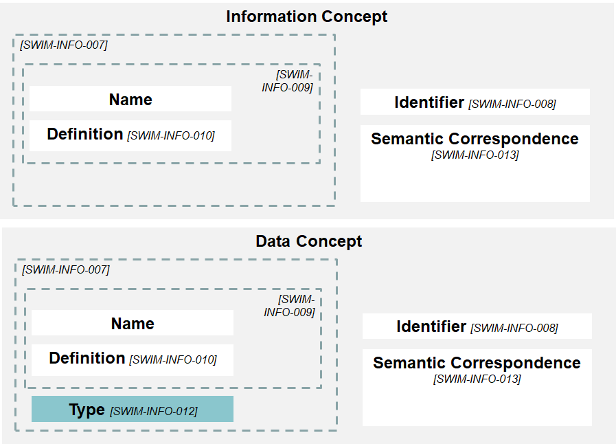 This requirement applies to information concepts and data concepts. However, the requirement treats them differently. This difference is visualised below. In effect, a data concept needs to have an associated data type (coloured below). SWIM-INFO-012 places additional requirements on the usage of data types. The method for establishing the semantic correspondence for the different concepts is also different (see SWIM-INFO-016 and SWIM-INFO-017).