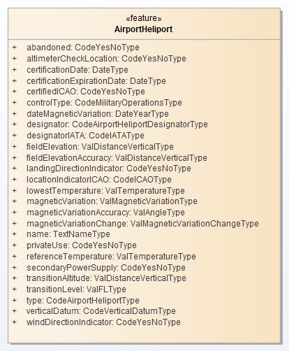 The figure below is used to show how the different concepts would appear in UML. In this case, the example is taken from AIXM 5.1.1. The AirportHeliport feature is an information concept as it has a name and a definition. It contains attributes such as locationIndicatorICAO which are data concepts - they have names, definitions and data types (CodeICAOType).