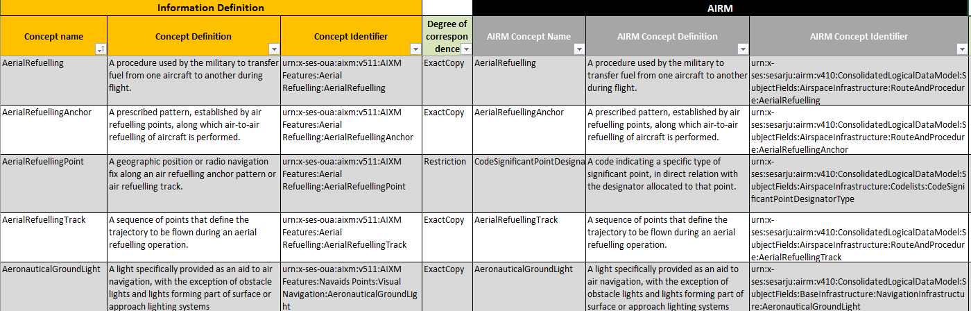 The Aeronautical Information Exchange Model (AIXM) performed its initial semantic correspondence analysis using a spreadsheet. The figure below shows what this looked like. The left hand side of the diagram shows the concepts exported from the AIXM UML model. The concepts are AerialRefuelling, AerialRefuellingAnchor, AerialRefuellingPoint, AerialRefuellingTrack, AuthorityForAerialRefuelling. The right hand side of the diagram contains an export of the matching AIRM concepts.