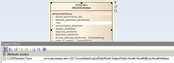 The figure below is taken from a SESAR deliverable. It shows a snippet of a larger UML diagram. It shows how the code attribute in the OtherInformation class traces to the Aircraft.icaoAircraftAddress in the AIRM. The unique identifier of the AIRM (see SWIM-INFO-019) has been used to fill in the tagged value for the concept being traced.