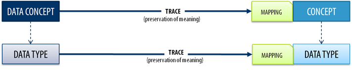 The second trace is particular to data concepts. This trace still concerns the semantics of the data types being mapped to each other. However, it is important to bear in mind the requirement on the compatibility of data types - that requirement will make data concept traces much easier.