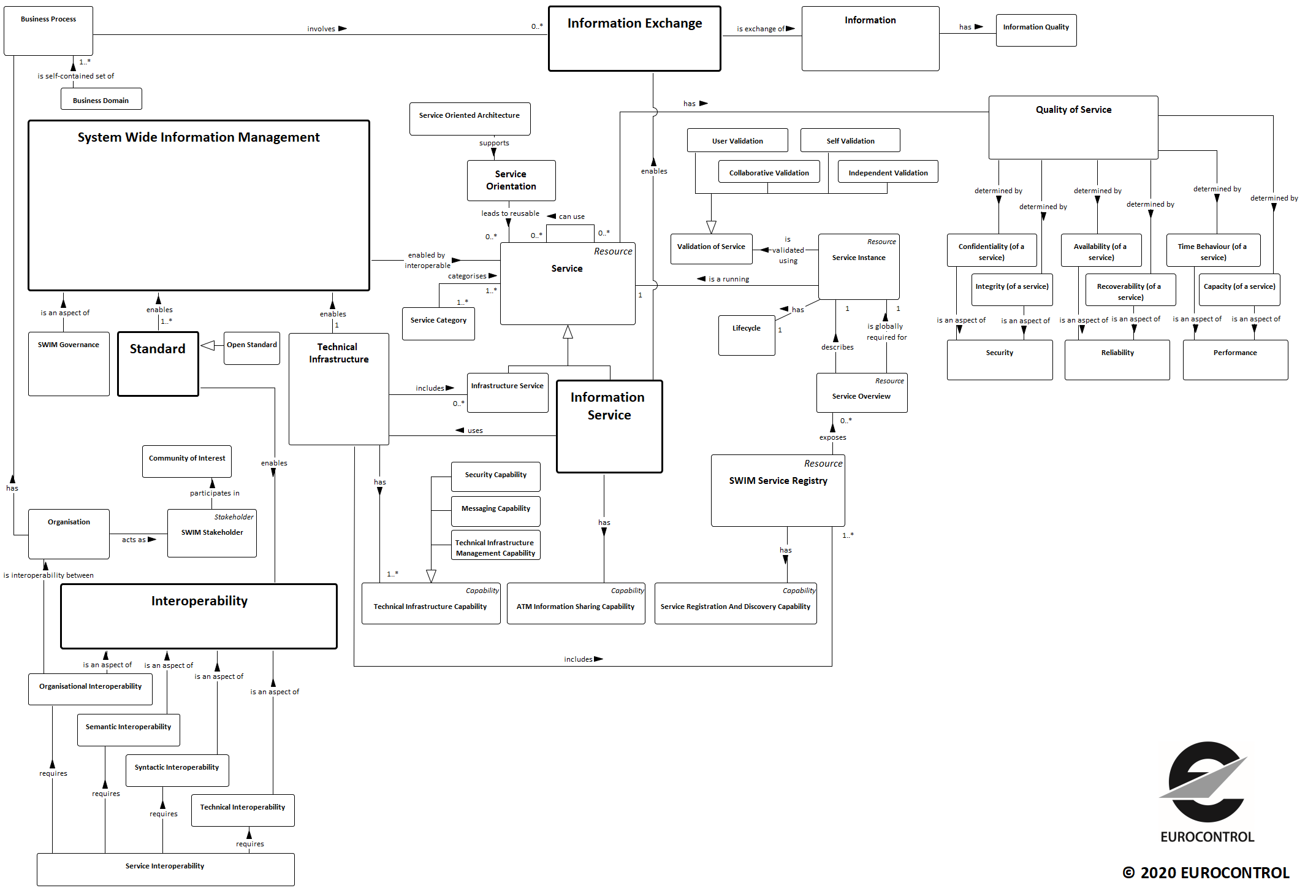 SWIM is about collaborative organisations realising ATM information exchanges using information services that are interoperable and reusable. Interoperability has many aspects ranging from the integration of business processes across collaborating organisations to the technical linking of information systems, and is achieved through the reuse of common standards. The following picture shows these concepts in relation to their surrounding landscape: