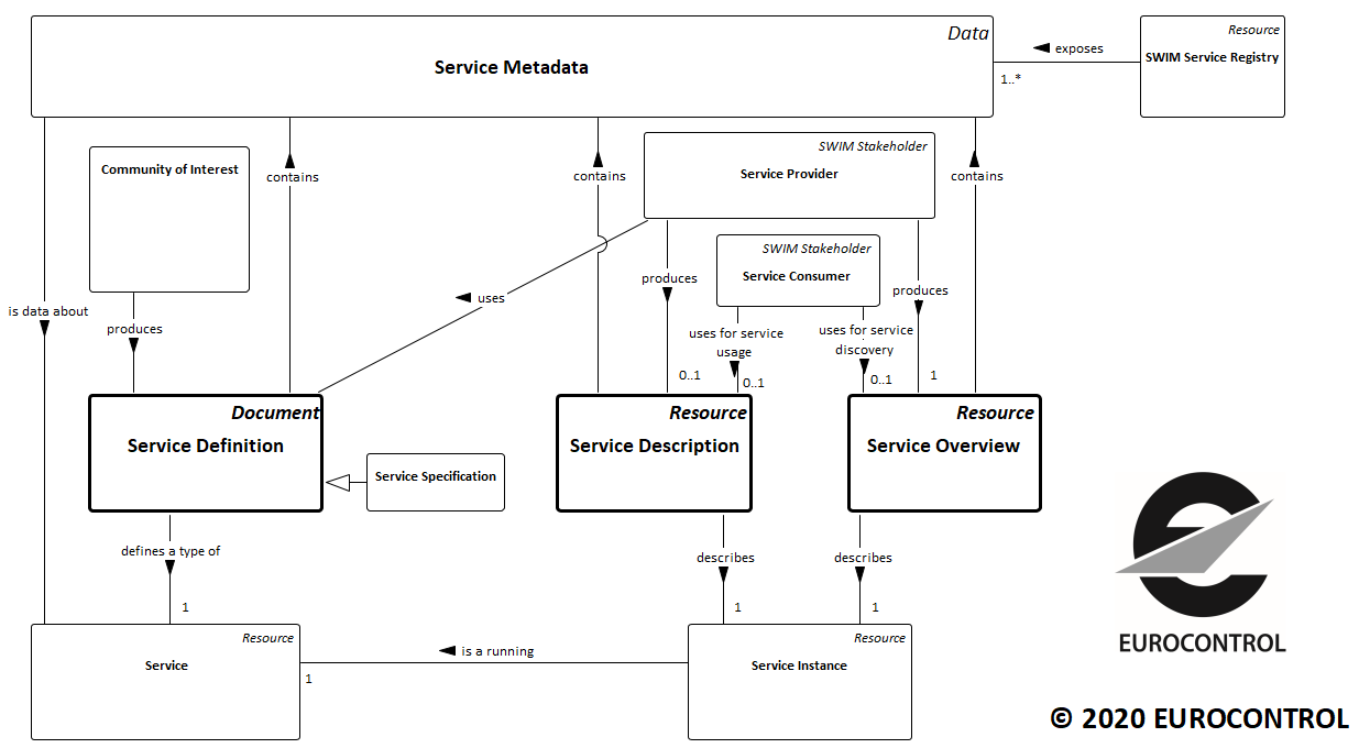 Service metadata is commonly exposed by SWIM Service Registries. Service overviews and service descriptions are examples of resources capturing service metadata. Service overviews are used by service consumers for initial discovery of the service instances that are or will be available for consumption. Service descriptions are used by service consumers to discover service instances and understand how they can be used.