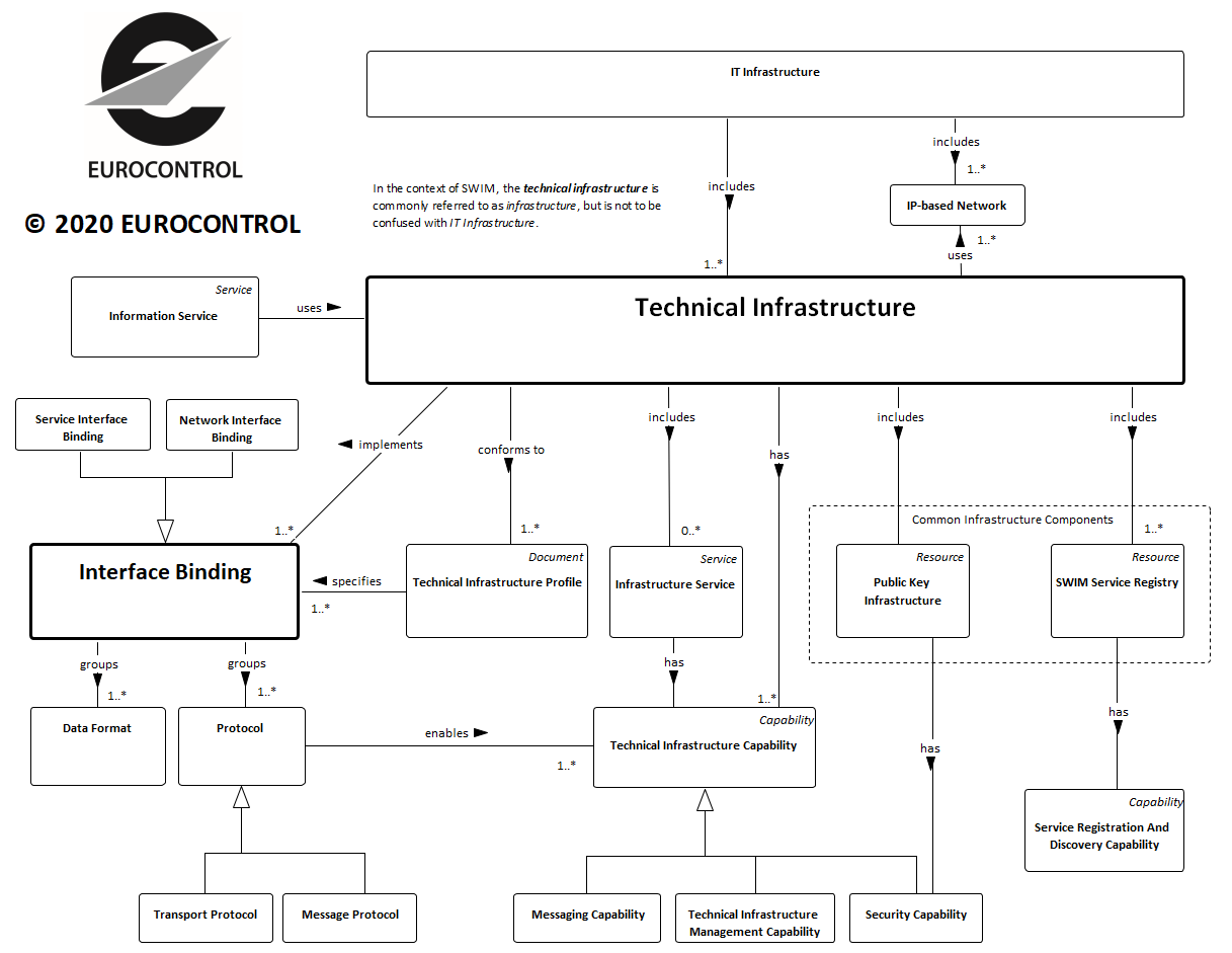 The technical infrastructure designates the assembly of software and hardware used to enable the provision of information services. In the context of SWIM, the technical infrastructure is commonly referred to as infrastructure, but is not to be confused with the wider notion of IT infrastructure. The technical infrastructure includes infrastructure services and common infrastructure components such as the SWIM Service Registries. The technical infrastructure profiles specify particular groupings of data formats and protocols called interface bindings that can be used for implementing information services.