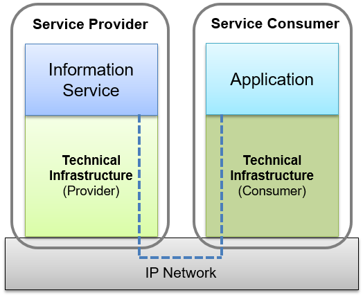 The SWIM TI is a collection of software and hardware used to enable the provision of information services. Applications consume information services via a SWIM TI that enables the exchange of information over an IP network. Both the service provider (responsible for the information service), and the service consumer (responsible for the consuming application) are responsible for the implementation of their own infrastructure [1] .