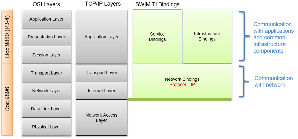 The Service and Infrastructure Bindings correspond to the Application Layer of the TCP/IP Stack while the Network Bindings correspond to the Transport and Internet Layers. Figure 3 relates the different Bindings with the TCP/IP stack, the OSI layer model and the protocol scope covered by ICAO Doc 9896 and Doc 9880 (P3-4).