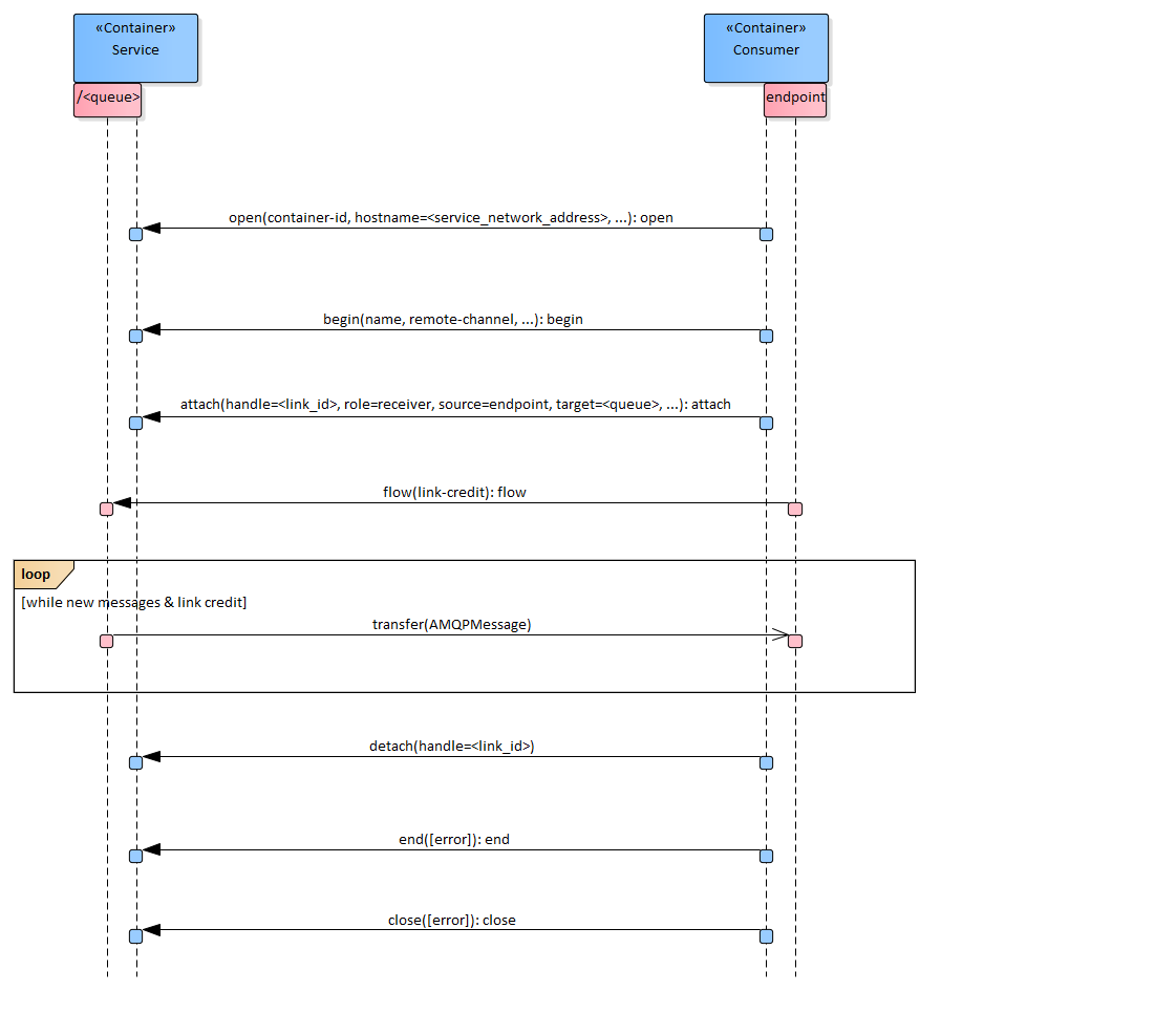 - The Consumer sends an attach performative to create a directional link from the queue to the Consumer’s endpoint to enable the transfer of messages.