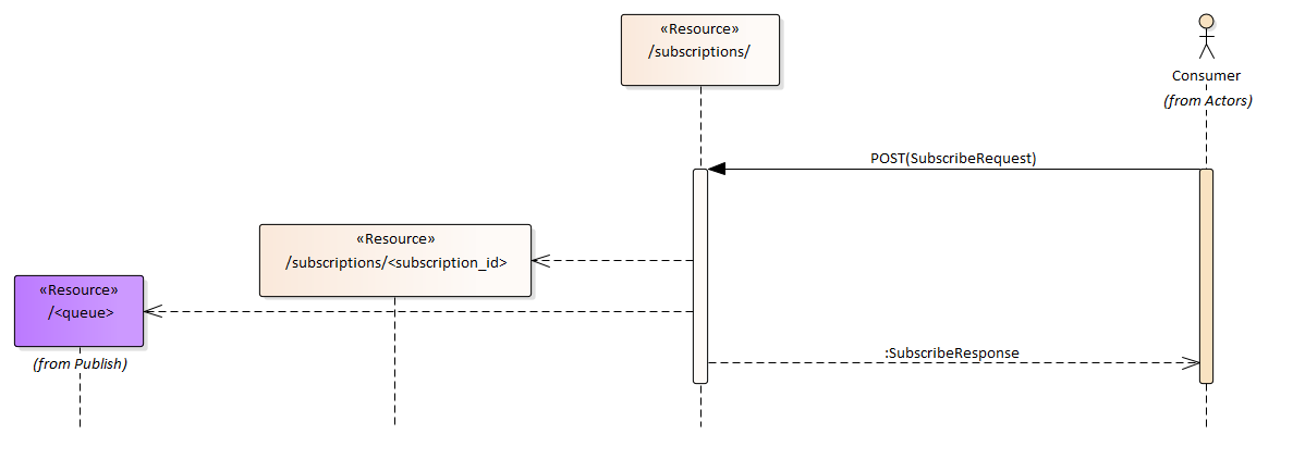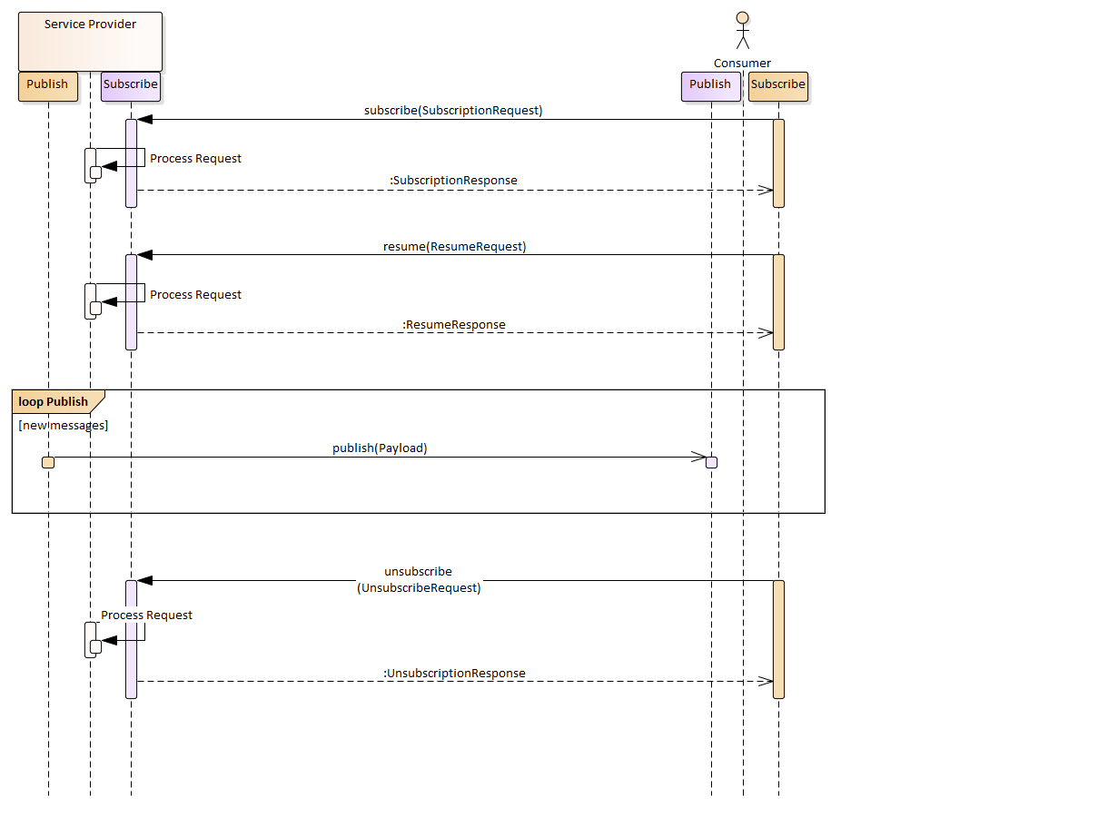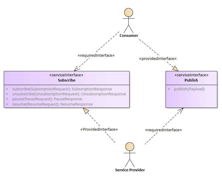 What is usually common across implementations is that the Subscribe interface is implemented using a Request/Response pattern [1] as subscribing to the service typically entails some form of approval by the service provider which in turn provides back certain information detailing the means to use to obtain the publications. This interface is provided by the Service Provider and required by the Consumer.