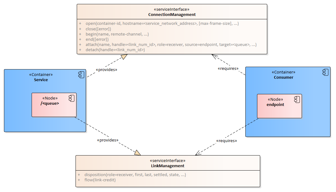 The following interfaces provide technical operations to perform connection establishment, control flow of messages and settle their delivery state. From the technology agnostic service design described in section 2 these are technical details of implementation specific to the technology that are abstracted from the high-level service description.