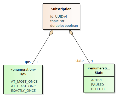 - durable: Expresses the durability of the subscription, a subscription is durable if messages are preserved while subscribers are offline. Sometimes can be accompanied by a time-to-live attribute that indicates the expiration time of non-delivered messages.