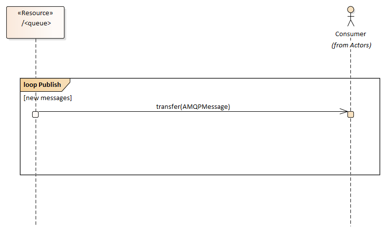 The following diagram shows the nominal flow followed by a Consumer that connects to a queue to receive message publications.
