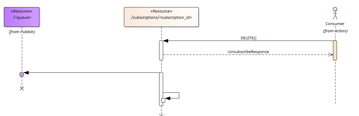 The following sequence diagram shows the nominal flow of a subscription, subsequent publications and final unsubscription from the service: